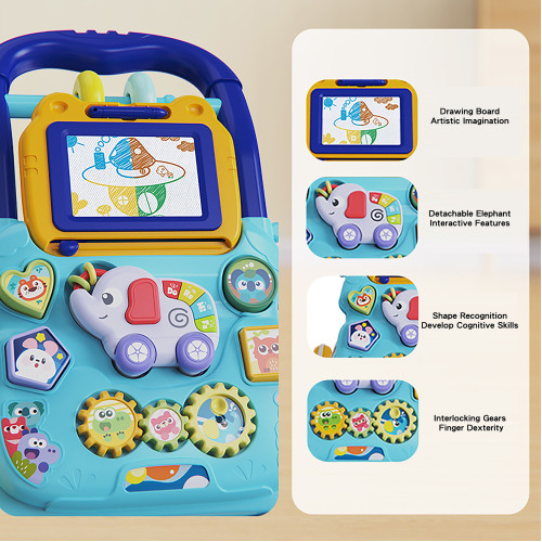 - Interactive learning baby walker features a removable toddler play panel that develops fine motor skills.