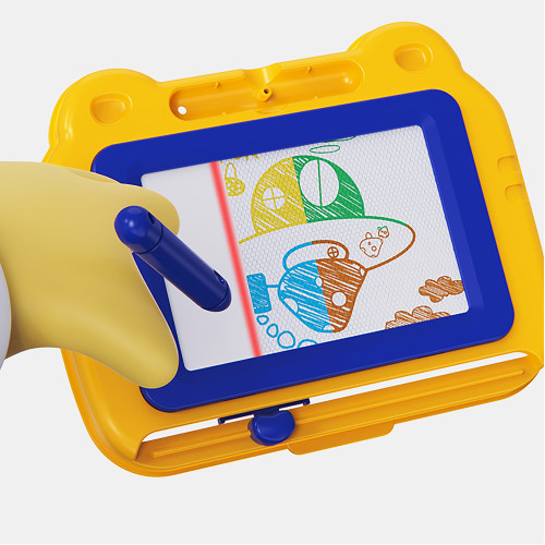 - Uniquely designed drawing and writing board with pen and colorful shape props. Kids can draw, stamp, or just scribble encouraging their imaginations. Slide the attached eraser to start all over again! Parents can also join in to create more fun with this magnetic doodle board.